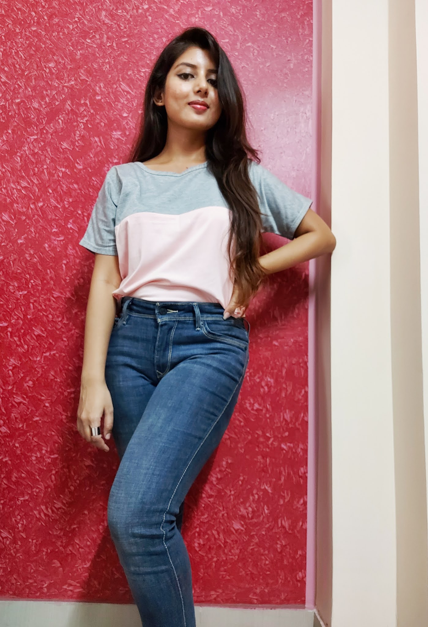 This one is a pretty basic and simple look. Here I have worn a loose by coloured t-shirt with blue jeans. This is perfect for attending classes or going for a casual work, comfortable and simple. Pair it up with sneakers and a backpack for that back to college look!