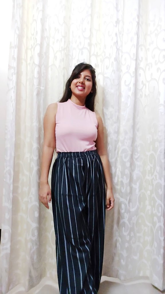 High neck tops look very classy and chic and I love to wear them. I paired this light pink high neck crop top with the striped palazzo pants. This look would go well for an office video conference or as a casual work from home outfit. You can skip the jewellery with this or maybe pair small earrings if you want a little dressed up look.