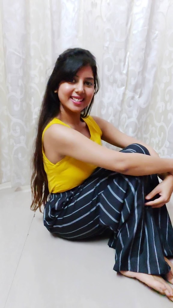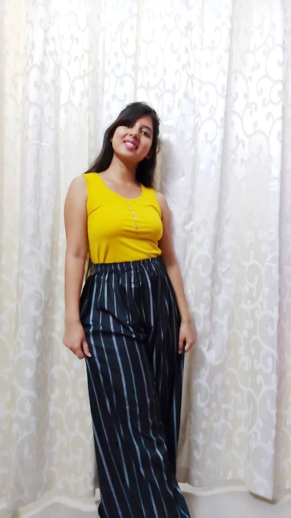 In the second look I went for this bright yellow tank top with button detailing at the front. It looks cool as the bright colour of the top balances the dark colour at the bottom. You can wear small golden earrings and white sandals to complete the look. This is perfect for a quick video chat with your friends to keep up with the bright and uplifting vibe!